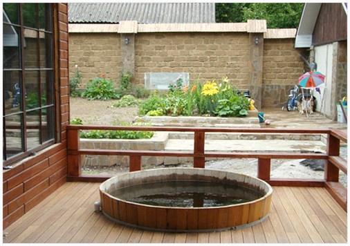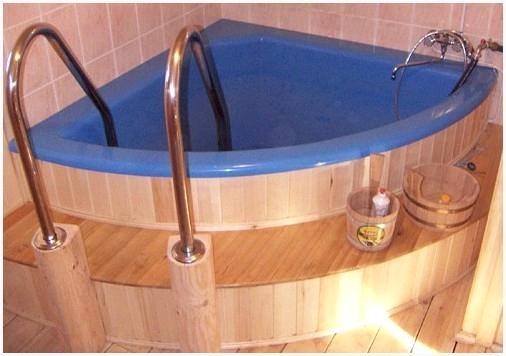 В этом случае дела обстоят существенно проще. Приобретается вместительный резервуар из дерева либо купель для бани из полипропилена и производится подключение к канализации и стилизация (внешняя отделка).