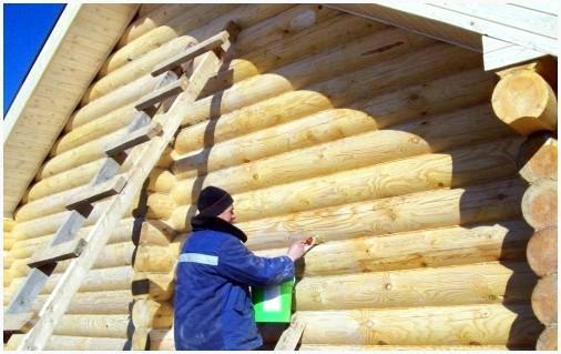 Отвечая на вопрос: «В то время, когда приступать к покраске бани по окончании постройки?», нужно подчернуть, что в этом случае нужно ориентироваться степень усушки бревен. Приступать к работе возможно лишь в том случае, если влажность древесины не превышает 20 %. Убедившись в том, что указанный параметр достиг совершенного значения, шепетильно очистите поверхность от пыли, особенно в труднодоступных местах, по окончании чего протрите лоскутом увлажненной ткани. Произведя очистку, обработайте поверхность антисептиком и антипиреном, нанося любой из них в два слоя, и дождитесь их окончательного подсыхания. Это займет не меньше 2-3 недель.