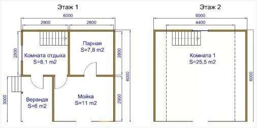 Еще один проект – баня с просторной гостевой комнатой. В этом случае постройка выполняется из бруса сечением 100*150/150*150. Сборка ведется на деревянные либо железные нагели, межвенцовый утеплитель – жгутовое полотно. Угловое соединение выполняется в полбруса. Материал межкомнатных внутренних перегородок – брус. Обустройство пола из обрезной доски сечением 150*50, ход укладки – 800.