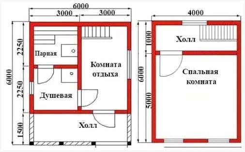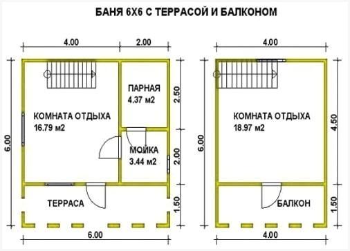 Обрисованная баня с мансардой (брус, 6*6 м) предполагает размещение санузла в моечной. В случае если печь установить в парилке, то растапливать ее придется с комнаты отдыха. Высота потолков на первом этаже образовывает 2,1 м – этого достаточно, чтоб в парилке установить двухъярусные угловые полки.