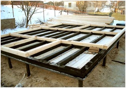 Сваи вворачивают либо забивают в землю, а сверху объединяют балками. Расстояние между вспомогательным и основным столбом — около 2-х метров.