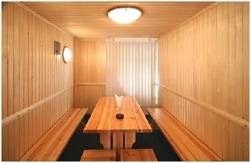 - Обычно в нем размещают раздевалку, моечную, устанавливают стол, за которым проходит дружеское общение, ставят комод либо стеллаж для хранения банных принадлежностей. На освещении экономить не следует, в предбаннике нужен броский, а лучше естественный свет. Обустройство окон примет решение эту проблему.
