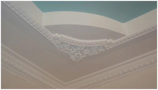 - Отделку потолка возможно провести посредством многослойной шпаклевки, гипсовых элементов, и ручной выкладки декоративных элементов. Финишную обработку потолка выполняют посредством краски для мокрых помещений. Она предотвращает плесень и отслаивание.