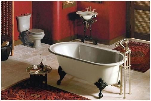 - Ванна с широкими закругленными бортами и высокими коваными ножками – предел мечтаний любого эстета, в ней возможно часами нежиться в ароматной водице и читать классическое произведение. Смеситель стоит подобрать в соответственной параллели – золотые либо серебряные винтажные краны, ручки в стилистике слоновой кости, обтекаемые формы и полное удобство размеров. Красивой идеей станет дополнительная железная полочка для хранения приятных мелочей, и поднос с крепежами для установки на бортах самой ванной.