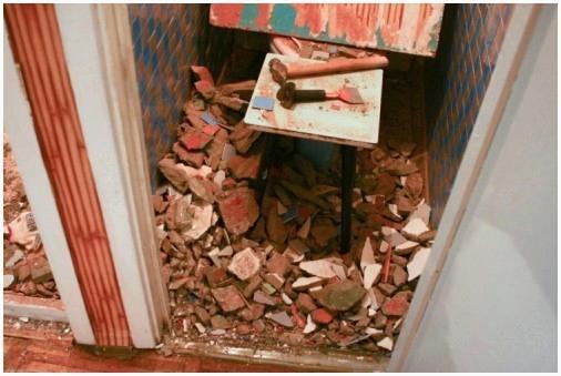 - Ветхую плитку стоит снимать особенно щепетильно, поскольку стенки обычно имеют скрытые деформации, резкие толчки смогут усугубить ремонтные работы дополнительными объемами. Штукатурку нужно проверить на прочность, все отступающие части потребуется скрупулезно сбить, покинув лишь прочные ее участки.