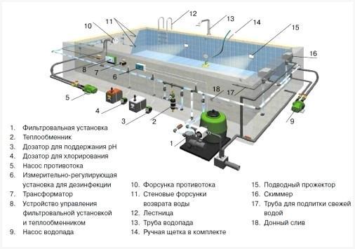 - В упрощенном виде схема выглядит так: переплескиваясь через борт, вода стекается по желобу в особый бак. Из него пройдя через фильтровальную установку, где она обрабатывается реагентами, нагревается и поступает в чашу бассейна при помощи донных форсунок.