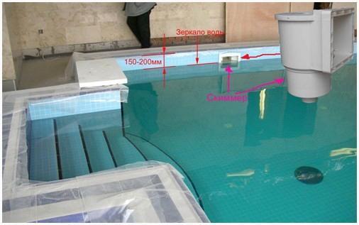 - За водообмен отвечает целый комплекс закладных элементов, от их грамотной установки зависит циркуляция водного слоя. Удаление пены и мусора с поверхности осуществляется скиммером.