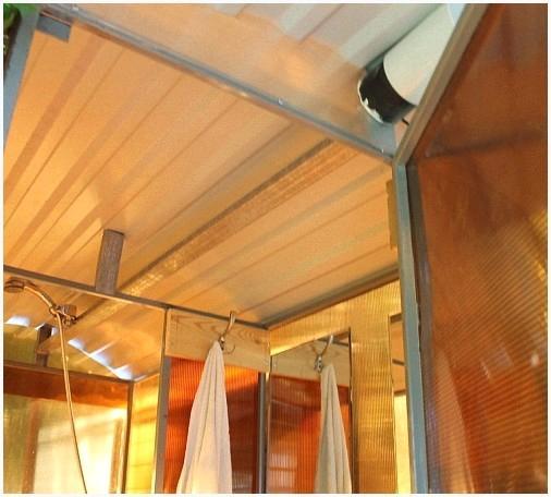 - При применении для того чтобы душа в качестве летнего, поликарбонат отлично прогревается, исходя из этого летом нагревательные элементы фактически не задействуются;