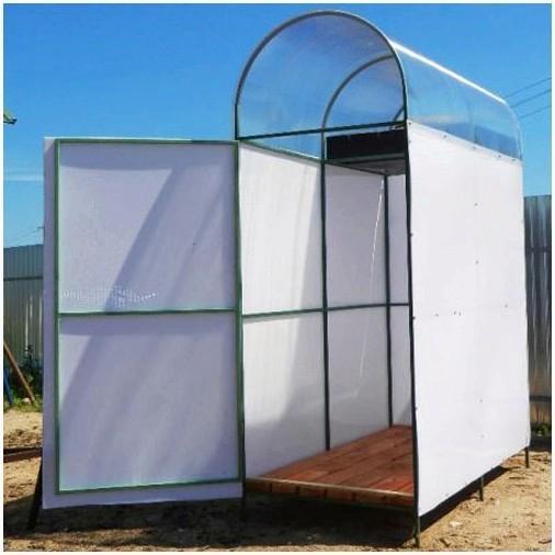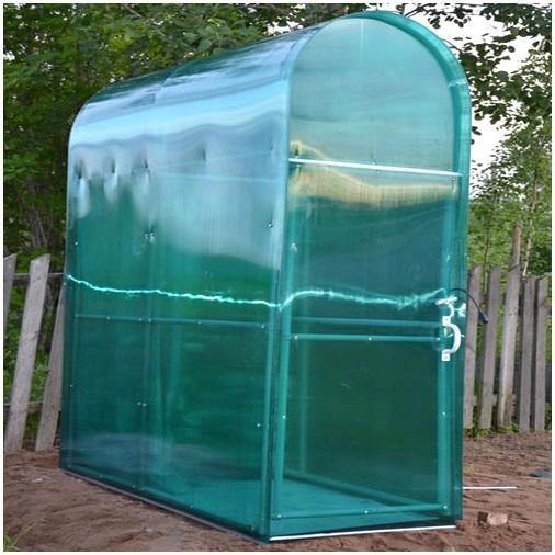 Если вы желаете выстроить дачный душ из поликарбоната, то возможно реализовать мечту двумя дорогами. Первый — легкий летний душ с маленьким баком для воды. Второй — более основательное сооружение с фундаментом и подогревом.