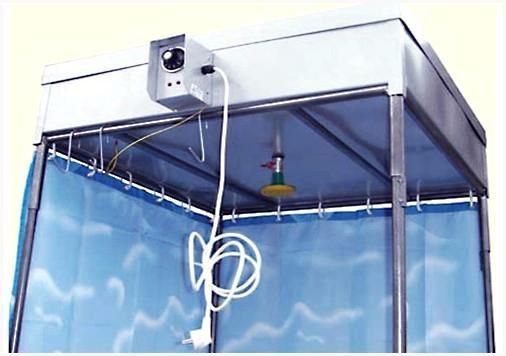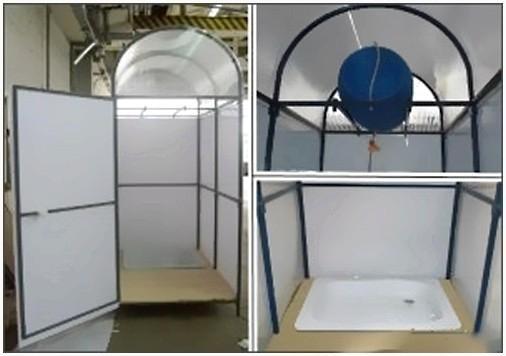 На крыше устанавливают бак с водой, нагреваемый солнечными лучами. Благодаря герметичности кабинки обеспечение постоянства температуры не есть проблемой.
