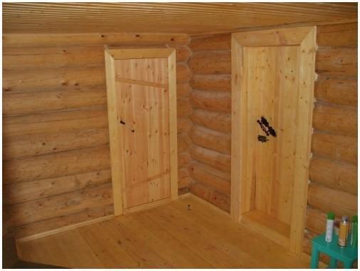 Установку дверей в баню на входе направляться создавать при помощи окосячки, применяя пазы в обсаде и гребни на бревнах, дабы избежать перекашивания входной двери при усадке деревянного строения. Коробку для дверного проема в бане изготавливают из толстых прямоугольных либо квадратных брусьев. Устанавливают её в проем гребневым методом.