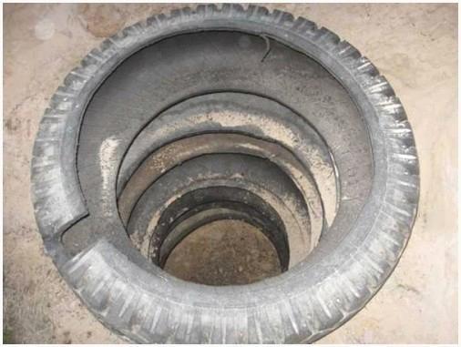 Если вы приверженец применения в ходе работы подручных материалов, для вас станет занимательной мысль монтажа сливной ямы из ветхих шин (к примеру, покрышек от грузовиков), в которых проделывают отверстия и частично срезают боковые поверхности. По окончании проведения данных манипуляций, их укладывают в подготовленную яму одна на другую и засыпают фильтрационными материалами.