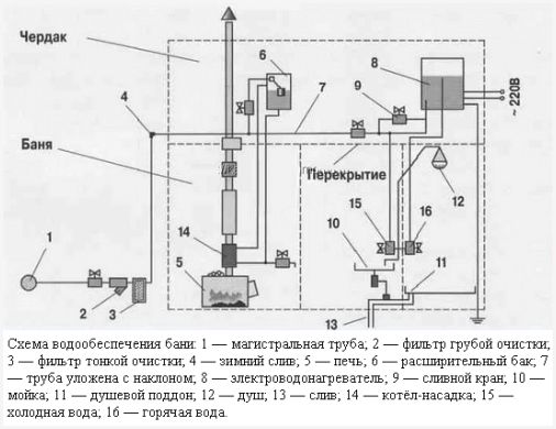 По окончании завершения работ по обустройству стенок резервуара, на дно ямы засыпают щебень, керамзит, битый кирпич, и другие материалы, владеющие свойством к фильтрации. После этого их засыпают слоем песка. От бани к сливной яме под уклоном, достаточным для естественного стекания воды, подводят трубы. Параметры уклона трубопровода следующие: в большинстве случаев, на любой метр трубопровода достаточно 10 миллиметрового уклона трубопровода. В ходе функционирования данного трубопровода, вода проходит через слой фильтрующих материалов и, очищаясь, впитывается в землю.