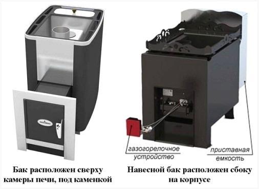 Существуют газовые печи с уже встроенным баком для воды и выносным вариантом. Первый вариант есть более эргономичным, потому, что вода нагревается благодаря продуктам сгорания горючего. Дымоход нужно устанавливать так, дабы он имел возможность проходить через нагреваемый количество воды. Нагрев бака создаёт и тепло, которое исходит от каменки. Таковой вариант разрешает не загромождать баню лишними устройствами.