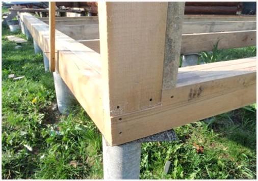 Горизонтальность укладки контролируйте строительным уровнем. При обнаружении отклонений оказывают помощь прокладки из нескольких слоев толя. Устанавливать промежуточные стойки нужно с учетом последующего монтажа теплоизоляции и обшивки. Для придания конструкции прочности обвязка и лаги крепят при помощи заблаговременно замурованных пластин из металла. Оказавшуюся обвязку целесообразно обработать особым раствором, предотвращающим гниение.