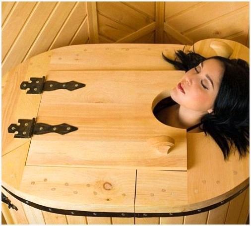 Для принятия процедуры направляться принять сидячее положение. Благодаря такому сидению, человек получает большое расслабление. Регулировка скамейки осуществляется в соотношении с высотой. Ноги человека находятся на деревянной решетке, другими словами на трапике.