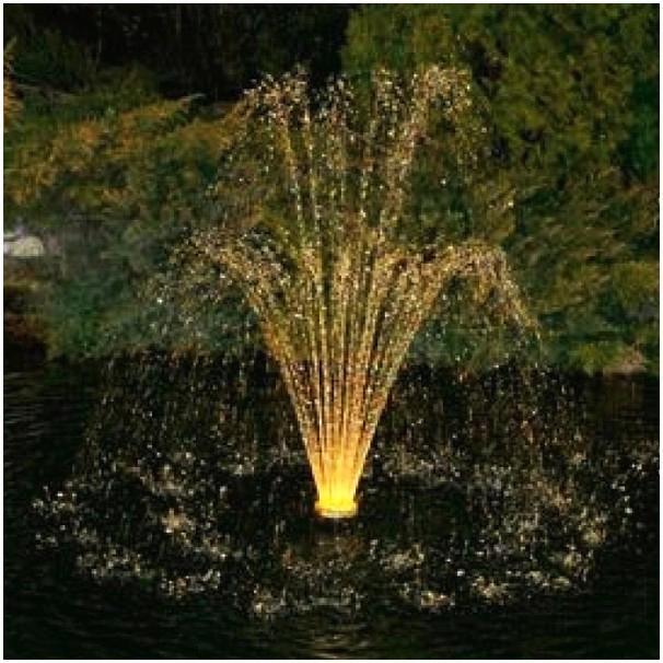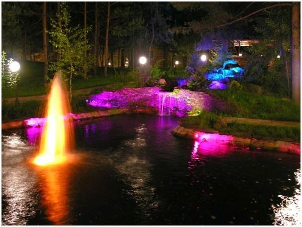При подводной подсветке создается эффект свечения воды, в случае если подсветка вращающаяся, то целый процесс преобразовывается в водно-световую феерию. Для этого употребляется вращательный механизм.