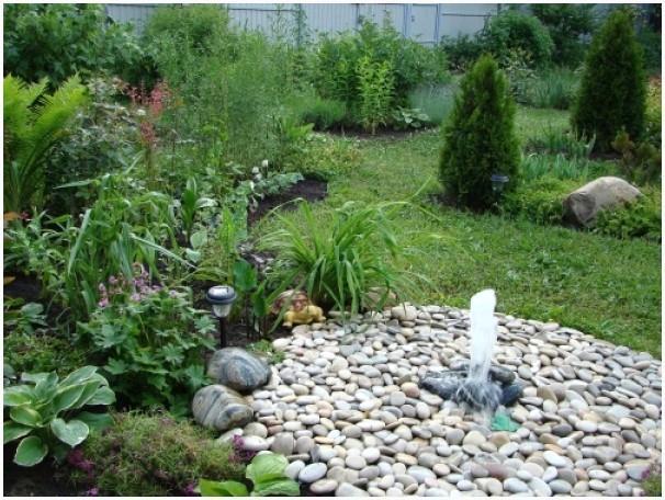 В случае если ваша дача напоминает красивый уголок природы, возможно сделать мелкий фонтан, напоминающий гейзер, бьющий прямо из-под камня. Возможно расположить фонтан и около неестественного водоема в окружении валунов.
