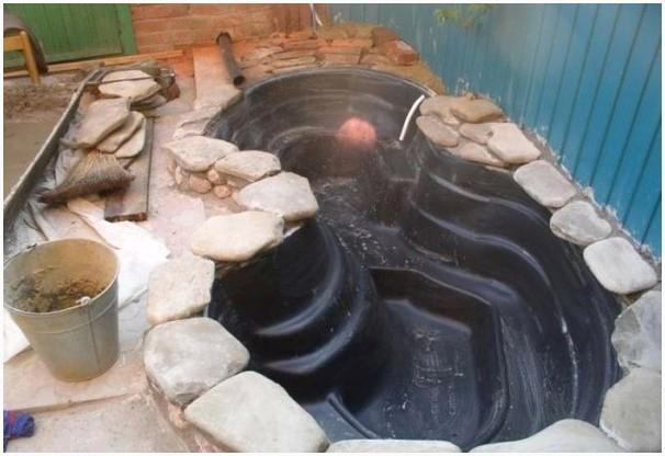 В случае если имеется готовая чаша для фонтана – для нее вырывают котлован. В другом случае также роют углубления и оборудуют его по типу мелкого бассейна: дренаж в виде песка, упрочнение стен, гидроизоляционный слой, подключение канализационного стока.