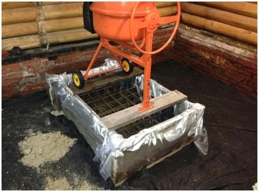 - Заливаем бетон до отметки, на 6 см ниже уровня пола в бане. Раствор берем такой же, как для фундамента бани.