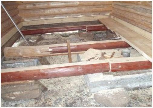 Что касается высоты, то данный показатель аналогичен высоте кромки базы (при ленточном фундаменте). В случае если же фундамент столбчатый, то деревянные лаги опираются на балки закладного венца, причем верх стоек-опор должен совпадать с этими балками. Перед монтажом лаг опоры накрываются гидроизоляцией (толь, рубероид, битум либо пергамин).