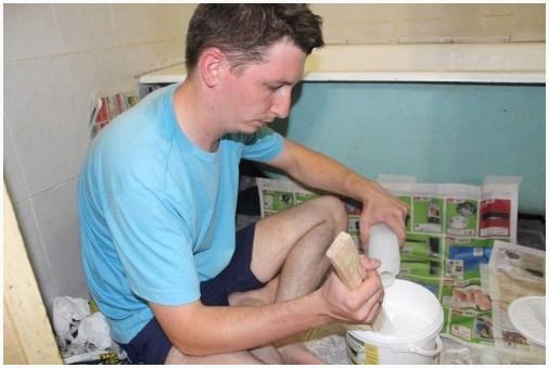 - Потом переходим к нанесению нового покрытия. Перед тем, как заняться подготовкой рабочего состава, шепетильно изучите инструкцию, прилагаемую к материалу. В соответствии с рекомендациям, смешайте краску с загустителем в указанных пропорциях. Советуют поделить состав на 2 равные части, поскольку в другом случае он не успеет загустеть, пока вы станете заниматься нанесением первого слоя.