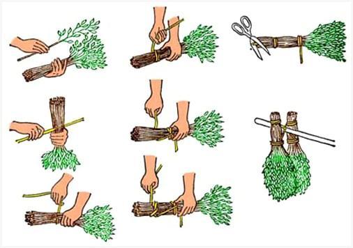 Побеги сортируют, листья, расположенные на уровне корня будущего веника, удаляют. Из веток формируют пучки и не весьма туго перевязывают крепкой ниткой, проволокой либо бечевкой. После этого связываю веники попарно.