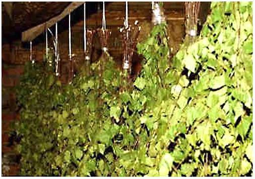 Сушить следует в чёрном, хорошо вентилируемом помещении. Подвешивают веники на высоте как минимум несколько метров от пола. Это нужно для приобретения верной формы, которая будет держаться долго. Хорошо вывешивать веники друг к другу не рекомендуется — в обязательном порядке оставляйте между ними зазор. Иногда переворачивайте их, что содействует равномерной сушке.