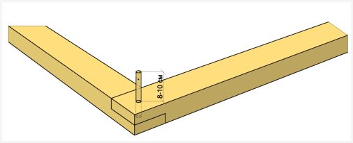 Элементы верхней обвязки соединяем между собой так же, как цокольные брусья. Устанавливаем ее по уровню и при помощи железных уголков либо гвоздей крепим к стойкам.
