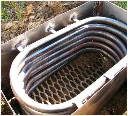 5. Для сборки змеевика применяют уголки и штуцеры. На бортовых участках просверлите два отверстия, через каковые осуществляется установка тройников. По окончании сборки системы обогрева производится ее гидравлическое тестирование. Потом змеевик кроме этого окрашивается в черный цвет.