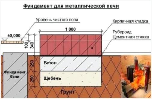 Определение размеров фундамента. Прежде всего нужно выяснить размеры фундамента. Стандартная высота стяжки, на которую возможно установлена банная печь, образовывает 20 см. Данный показатель есть наиболее оптимальным в том случае, если вы планируете обустройство конструкции, характеризующейся наличием «кирпичной рубахи» и массивного дымохода. Обустраивая цементную стяжку, нужно готовиться к тому, что пол пара встанет. Время от времени печи с выносной топкой реализовывают на «кирпичной подушке», но в этом случае нужно произвести тщательные расчеты, поскольку в случае если к высоте кирпичной подушки прибавить высоту фундамента – потолки существенно понизятся.