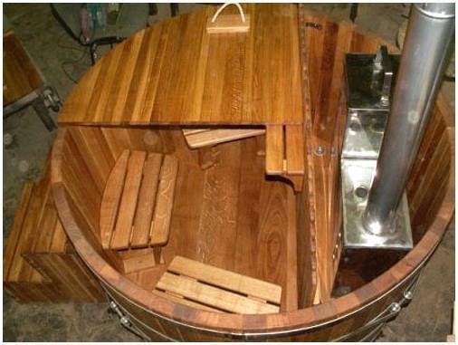 - Печь находится под дном купели либо в нее, в целях безопасности нагревательные элементы изолируют декоративной решеткой. Стоит подчернуть, что все детали купели выполнены из древесины.