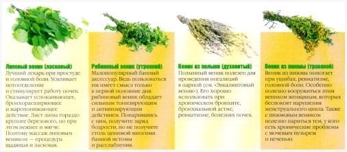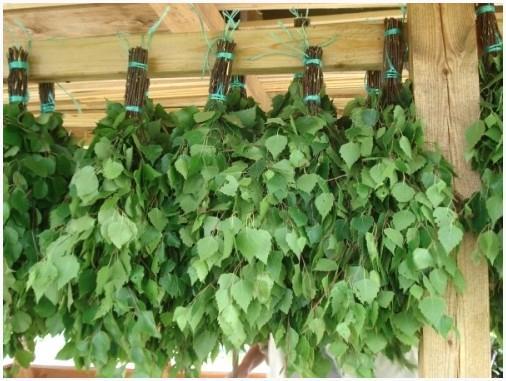 Березовые веники, применение которых оказывает болеутоляющее действие в мышцах и суставах по окончании интенсивных физических нагрузок. Оказывает противовоспалительное, заживляющее и успокаивающее воздействие, и содействует чистке лица при ее склонности к появлению угревой сыпи. Принципиально важно подчернуть, что применение березового веника благоприятно для курильщиков и людей, страдающих хроническими болезнями легочной системы, поскольку они содействуют расширению небольших бронхов и содействует отхождению мокроты;