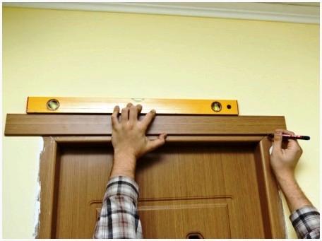 - Наличник с готовым углом прикладывается к дверной коробке, выравнивается по краям и понизу. Отмечается высота соответствующая внутреннему шуму дверной коробки;