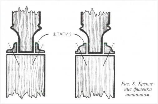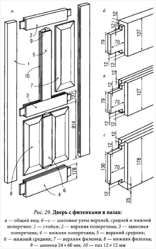 Дабы детали хорошо скрепить между собой, в нужных местах изготавливаются пазы и шипы, идеально подходящие по размеру. Для увеличения прочности креплений детали промазывают столярным клеем, а в местах крепления филенок делают фаски.