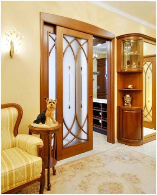 В качестве материалов для изготовления филенок лучше выбрать ДСП либо фанеру, что разрешит сделать конструкцию легкой и, одновременно с этим, недорогой. Если вы хотите сделать двери более массивными и солидными, применяйте более дорогостоящий массив дерева. Дабы повысить декоративные характеристики двери, обычно применяют вставки из стекла, которое возможно матовым либо прозрачным, и декорированным самым разнообразным рисунком. Весьма дорого и солидно смотрятся двери с витражными вставками.