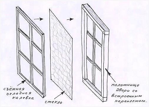 Если вы планируете сделать вставки из стекла, их кроме этого вырезают в соответствии с размерами двери, либо при изготовлении поперечных реек и перемычек руководствуются размерами вставок.