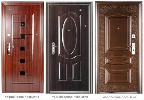 Молотково-трансферное покрытие – с одной стороны такая дверь облицовывается молотковым методом, который дает ей устойчивость к царапинам, сколам и пр. Со стороны жилища покрытие трансферное, что разрешает подобрать его в соответствии с интерьером.