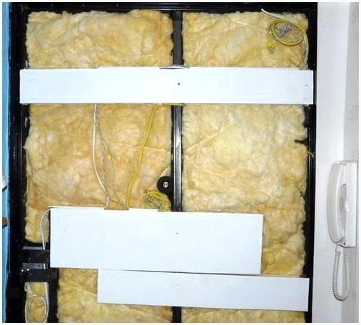 - Шумо- и теплоизоляция. Сейчас с внутренней стороны двери, прямо на железную поверхность, наклеиваем выбранный битумный виброизолирующий материал, а на него со своей стороны – шумоизолирующий материал. Наклеивание данных материалов производится по тому же принципу что и поклейка обоев. Слои перекрывают друг друга, лишние части удаляются ножом. Дабы материалы приклеились надежно и как следует нужно проводить работы при температуре превышающей 20 градусов. По завершении данного этапа, дабы усилить шумоизоляционный, а заодно и добавить теплоизоляционный эффект, оставшуюся свободной внутренность двери заполняют паралоном либо минеральной ватой. Закрепляют их посредством рыбацкой сетки и гвоздей, которыми ранее было прибито старое покрытие;