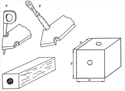- Подготовить кубики стороною 4 см: отсрогать и отшлифовать брусок сечением 4*4 см, длиною около 10 см;Распилить брус на кубики;В взятых заготовках сделать по два отверстия диаметром 8 мм по горизонтальной и вертикальной оси.