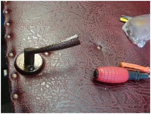 - Уложить дермантин на ламинированное полотно, завернуть припуски и зафиксировать мебельными скобами;Дабы кожа не «парусила» с внешней стороны ее нужно закрепить декоративными скобами.