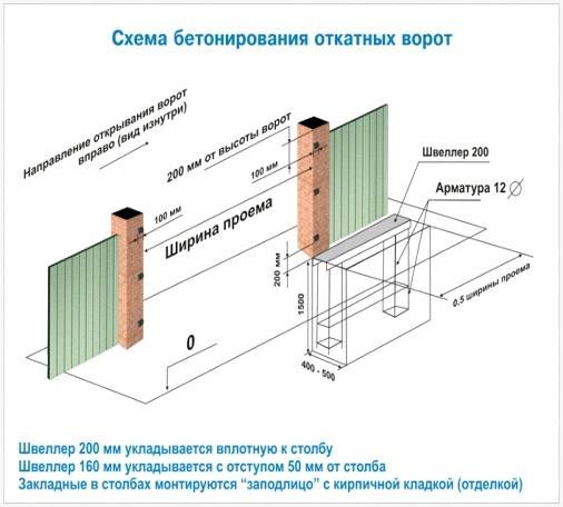 Выкопайте яму, протяженность которой образовывает половину размера воротного проема, ширина 400 мм, а глубина 100-125 см. Опустите швеллер в яму и залейте бетоном.