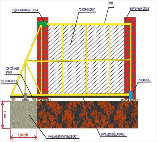 Движение откатных ворот происходит благодаря наличию консоли — твёрдого направляющего профиля, которую приваривают к каркасу конструкции. Направляющий профиль создаёт движение ворот по роликовым откатным углублениям, каковые закрепляют на фундаменте.