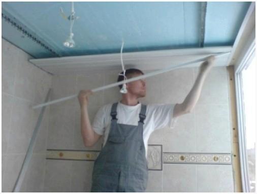 Процесс обшивки потолка пластиковыми панелями всецело аналогичен обрисованному выше, только с одним отличием – сейчас для соединения панелей ПВХ между стеной и потолком направляться использовать потолочный плинтус (поз. 6).