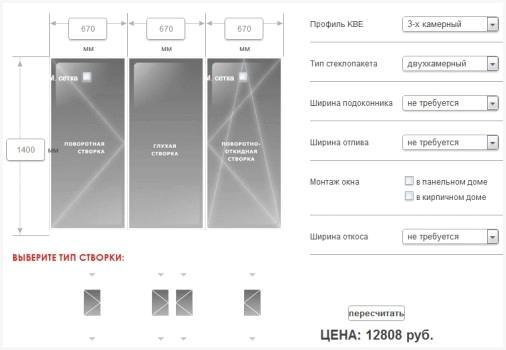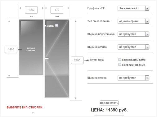 При покупке балконного блока с раскрывающейся дверью размером 210х67 см и глухим окном – 140х136 см нужно будет заплатить не меньше: