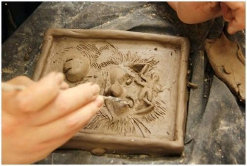 Заготовка в виде комка глины раскатывается в плоскую лепешку. Излишние края отсекаются особым инструментом – стеком. Размер готового изделия определяется исходя из размера печи, в которой будет проводиться процедура обжига. Фронтальная сторона выравнивается правилом.