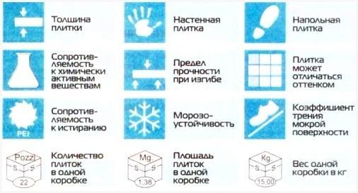 При выборе керамической плитки нужно кроме этого обратить внимание на ее упаковку чтобы узнать данные о торговой марке, стране-производителе, квадратных метрах и количестве плиток в упаковке, конечно о цвете и сорте. На упаковке кроме этого должны быть обозначены упомянутые выше пиктограммы и обозначения групп, к каким относится данная плитка.