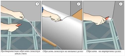 - Сейчас необходимо удалить покинутый по краям запас линолеума. В первую очередь, эта операция подрезания выполняется в углах. Тогда покрытие ляжет достаточно хорошо, дабы не совершить ошибку с подрезкой по периметру.