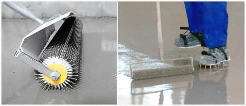 Принципиально важно! Для хождения по полу, залитому самонивелирующейся смесью, употребляются так именуемые краскоступы – подошвы с шипами, каковые возможно надевать сверху простой обуви. Хождение в краскоступах кроме этого оказывает помощь удалять пузырьки воздуха из смеси.