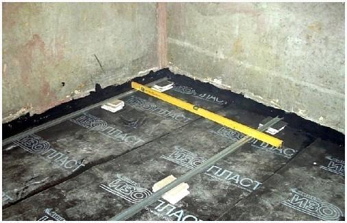 Перед работами направляться убедиться, что цементное покрытие совсем высохло. Для этого вовсе не требуется иметь прибор особого назначения. Выяснить влажность возможно и подручным способом, для этого на поверхность герметично скотчем крепиться маленький квадрат пластика либо кусок пленки. Через пара дней материал снимается, в случае если с внутренней стороны найдено множество больших капель, то укладывать доску еще запрещено. В этом случае нужно дать основанию еще время на высыхание либо провести дополнительные мероприятия по понижению влажности. Незначительный конденсат разрешает проводить запланированные работы. В любом случае, сперва расстилается полиэтилен либо рубероид, каковые предотвратят попадание жидкости в базовое основание. Укладка осуществляется с заступами на стены и ширина перекрытия материала должна быть не меньше 10 см. Швы проклеиваются скотчем либо влагостойкой мастикой.
